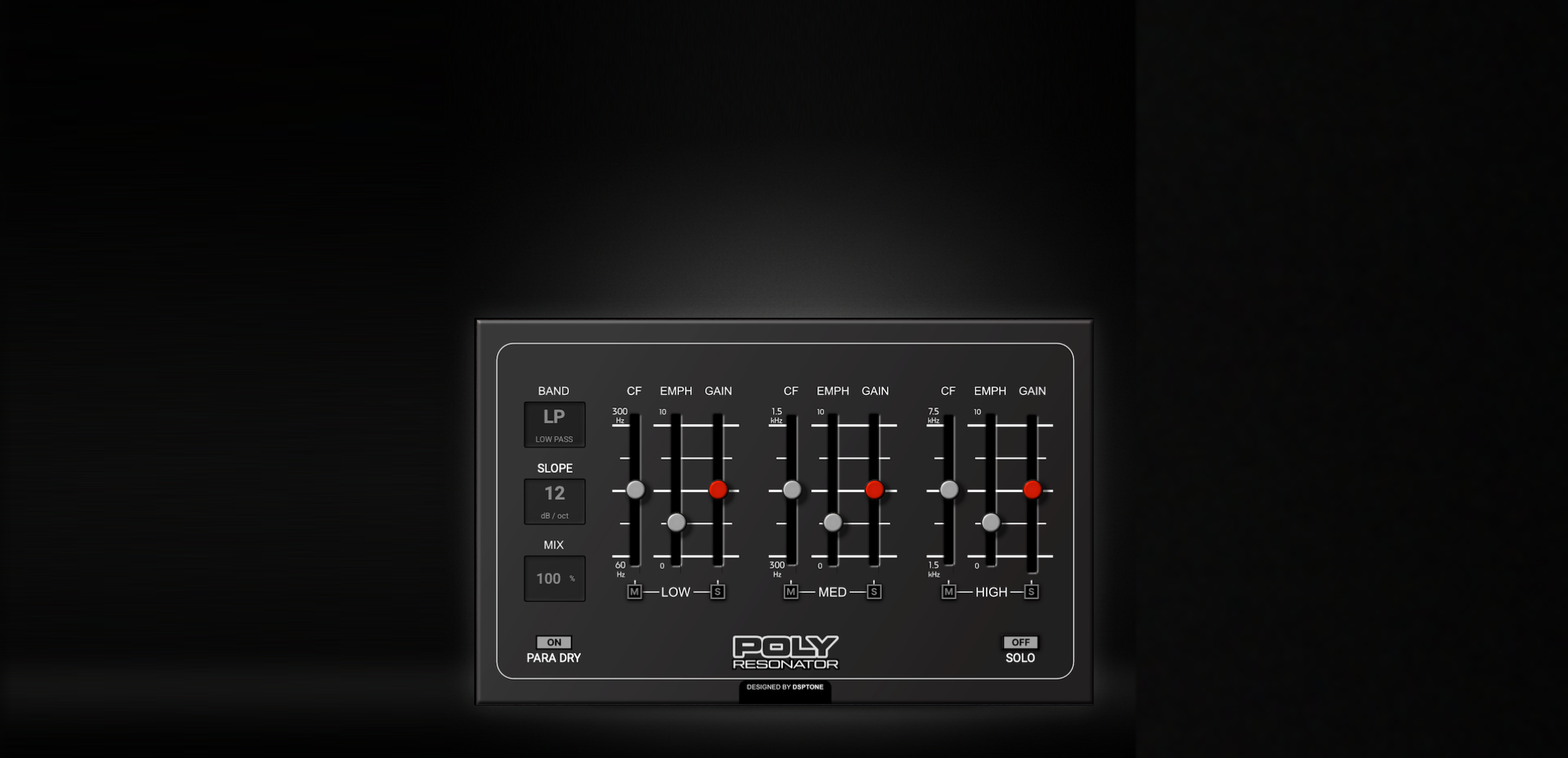 – GAIN: Adjusts the contribution of each band within the summed signal. Main resonator effect functional is reducing the band gain to cut signal. But you can also increase gain for any band for own needs.